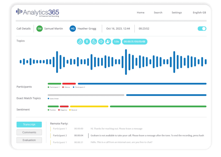 Analytics 365 is the easiest way for Compliance Offers to ensure that all Teams calls meet local, national and global compliance requirements. Automatically capture all required Microsoft Teams voice calls with policy-driven recording that ensures every regulated conversation is securely stored and audit-ready.